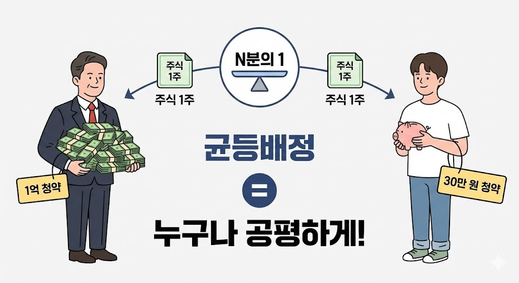 둘째, '균등배정' 덕분에 소액으로도 가능합니다. 예전에는 돈 많은 사람만 공모주를 많이 받아 갔습니다. 하지만 지금은 제도가 바뀌어서 **'균등배정'**이라는 것이 생겼습니다.