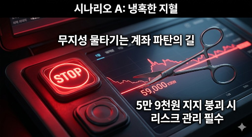 대응 전략: 현재 주가 59,000원은 과거 지지를 받았던 중요한 매물대이자 생명선입니다. 만약 이 59,000원~55,000원 박스권 하단이 뚫린다면 투심이 완전히 붕괴되며, 과거 1월 8일 기록했던 47,200원 바닥까지 다이렉트로 추락할 수 있는 아찔한 자리입니다. 무지성 물타기는 절대 금지이며, 단기 기술적 반등이 나와서 65,000원 선을 터치해 준다면 눈물을 머금고 비중을 대폭 줄여서 현금을 확보하셔야 살아남습니다.