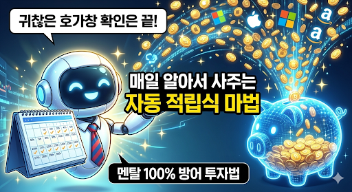 마치 은행 자동이체 적금을 붓듯이, "매일 아침 10시에 애플 주식 5천 원어치 매수", "매주 금요일마다 마이크로소프트 2만 원어치 매수"라고 한 번만 세팅해 두면 끝입니다. 내가 회의를 하거나 업무에 시달리는 동안에도 증권사 로봇이 알아서 내 계좌에 우량주 지분을 차곡차곡 쌓아줍니다. 주가가 오를 때는 수익이 나서 좋고, 주가가 떨어질 때는 같은 금액으로 더 많은 지분을 살 수 있어서 좋은 완벽한 '멘탈 방어형' 투자법입니다.