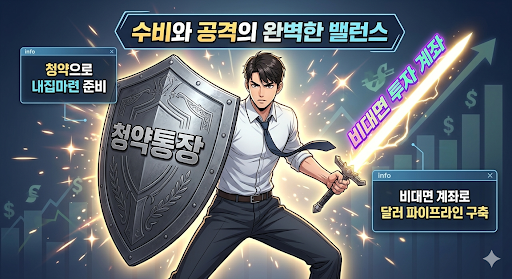 청약통장은 내 집 마련을 위한 필수 방어구이지만, 금리가 낮고 돈이 묶인다는 단점이 있습니다. 따라서 직장인의 재테크는 '청약통장(수비)'과 '투자 계좌(공격)'의 투트랙으로 가야 합니다.