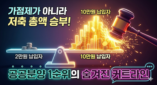 즉, 김 대리처럼 5년간 매월 2만 원씩 넣은 사람의 인정 금액은 120만 원이지만, 매월 10만 원씩 5년을 넣은 사람의 인정 금액은 600만 원입니다. 공공분양 커트라인 앞에서는 2만 원 납입자는 영원히 10만 원(또는 25만 원) 납입자를 이길 수 없는 구조입니다.