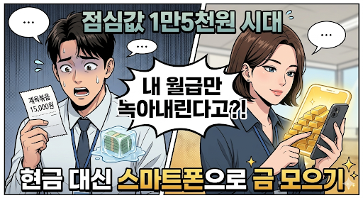 한숨을 쉬는 김 대리에게 옆자리 박 과장이 스마트폰 화면을 슬쩍 보여줍니다. "그래서 난 요즘 월급 받으면 주식 앱으로 '금(Gold)'을 1g씩 사 모으고 있어. 인플레이션 방어엔 금만 한 게 없거든."