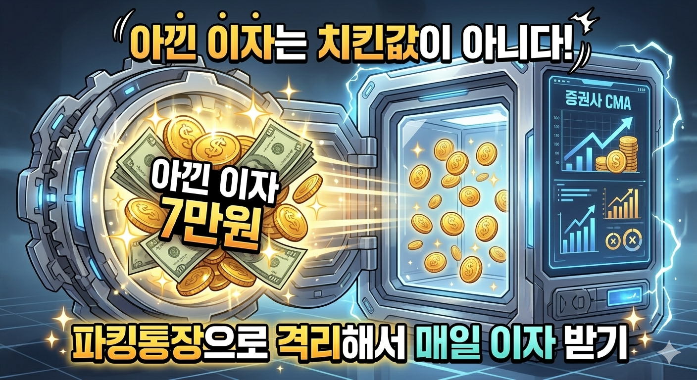이자 다이어트로 굳은 돈은 무조건 '증권사 비대면 계좌'로 이체하여 격리해야 합니다. 하루만 맡겨도 매일 복리 이자가 붙는 'CMA 파킹통장'을 개설해 이체해 두십시오. 은행에 이자로 바칠 뻔했던 피 같은 돈이, 이제는 증권사 계좌에서 스스로 이자를 만들어내는 기특한 효자로 다시 태어나는 순간입니다.