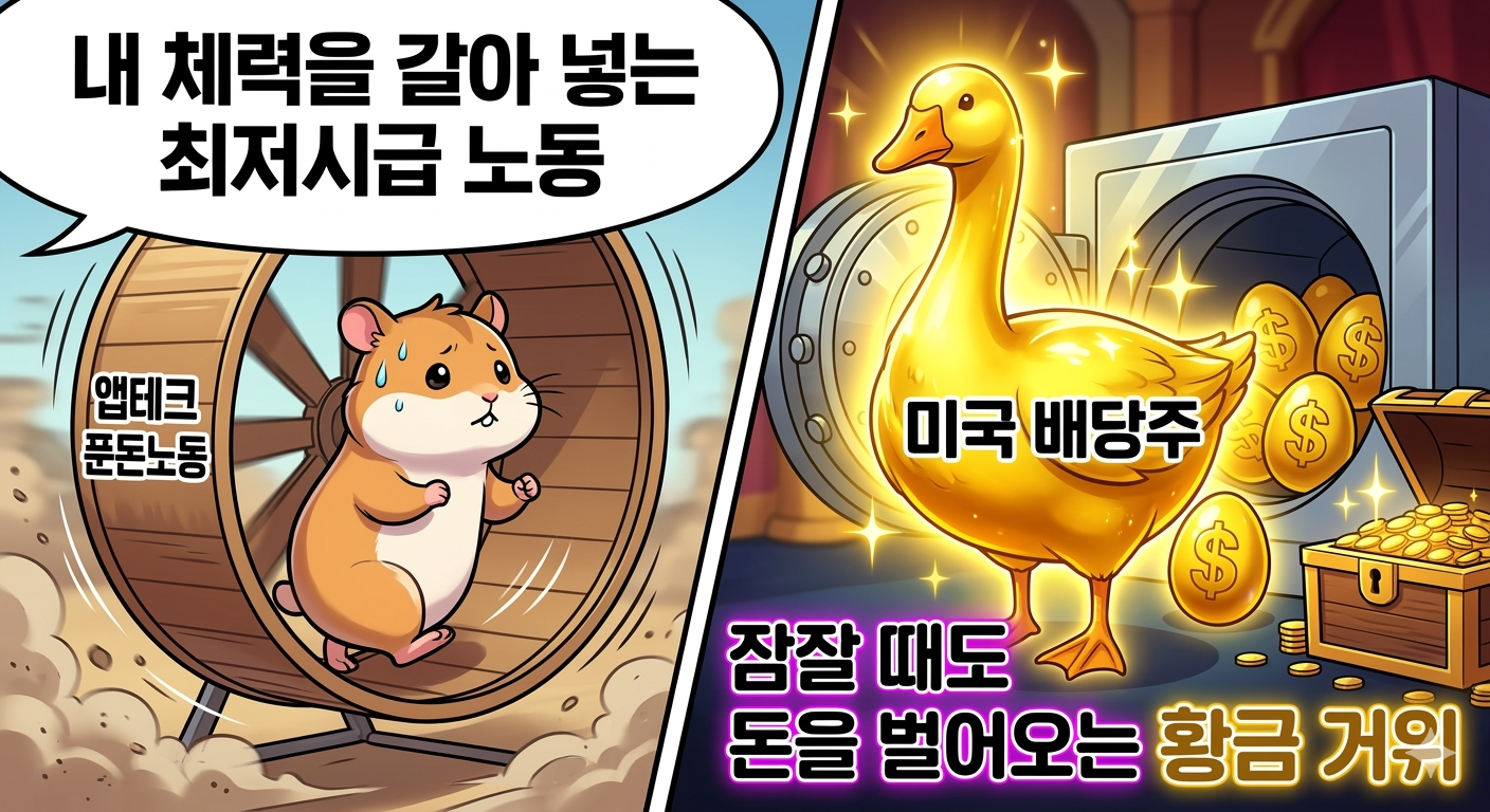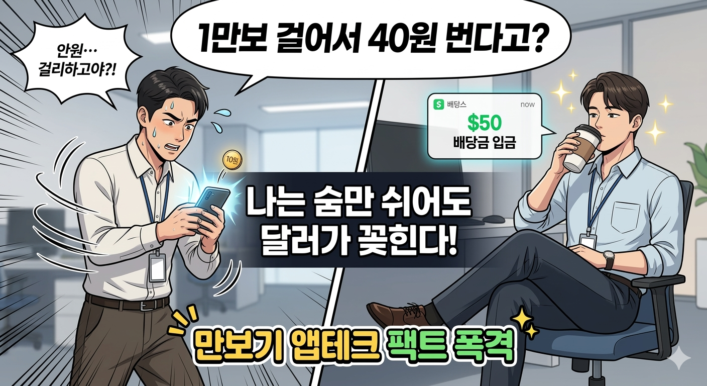 "김 대리야, 넌 1만 보 걸어서 40원 받냐? 난 방금 숨만 쉬었는데 미국에서 5만 원 입금해 줬다. 폰 그만 흔들고 배당주나 사 모아라!"