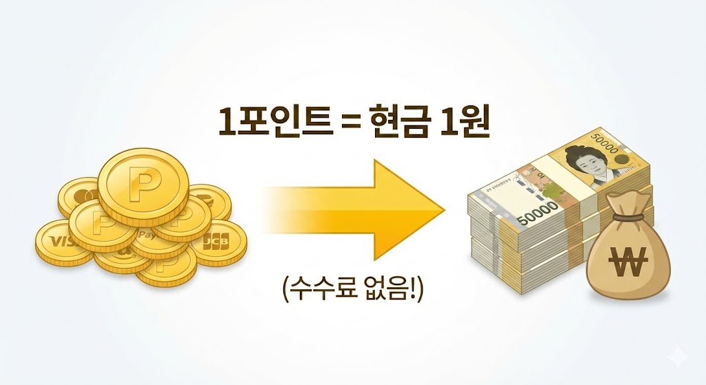 하지만 이제는 법이 바뀌어서 **'1포인트 = 현금 1원'**으로 계산하여 내 통장으로 직접 이체할 수 있게 되었습니다.