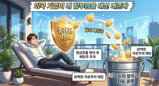 파킹통장 이자와 절약한 생활비를 모아 중개형 ISA 계좌에서 배당률이 높은 미국 우량 ETF를 매월 적립식으로 사 모으십시오. 푼돈 아끼려고 중개 마켓에서 위험한 현금 거래를 하던 하수에서 벗어나, 현금흐름을 통제하고 배당금으로 할부금을 상쇄시키는 진짜 투자자의 길로 들어서게 됩니다.