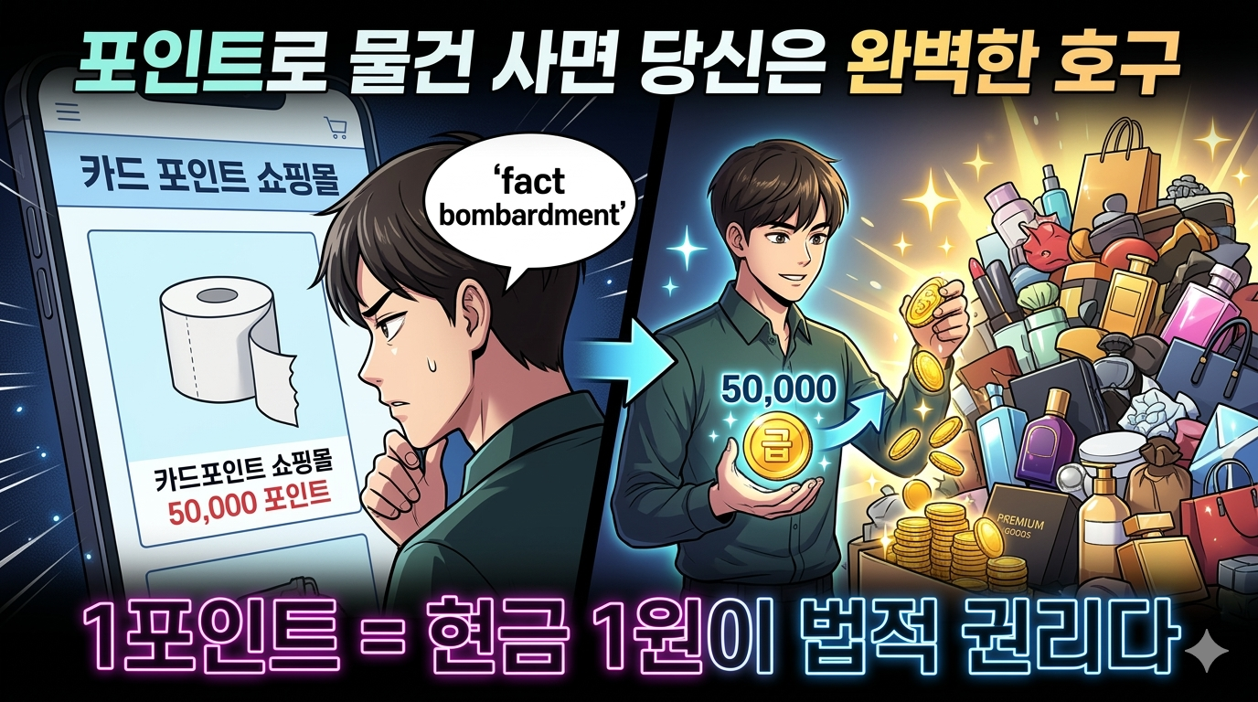 많은 분들이 카드 포인트가 쌓이면 카드사 전용 쇼핑몰에 들어가서 휴지나 후라이팬 같은 생필품을 비싸게 주고 삽니다. 이것은 카드사들이 가장 원하는 완벽한 호구 시나리오입니다.