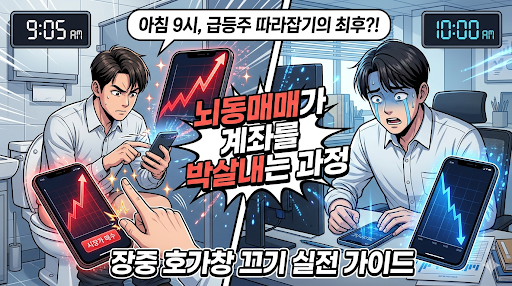아침 장 초반 30분은 거래량이 폭발하는 시간입니다. 위아래로 10%씩 미친 듯이 흔들리는 차트를 보고 있으면, 나도 모르게 심장이 뛰고 뇌동매매(충동적인 추격 매수) 버튼을 누르게 됩니다. 이성적인 기업 분석이 아니라 철저한 도박사의 흥분 상태가 되는 것이죠.