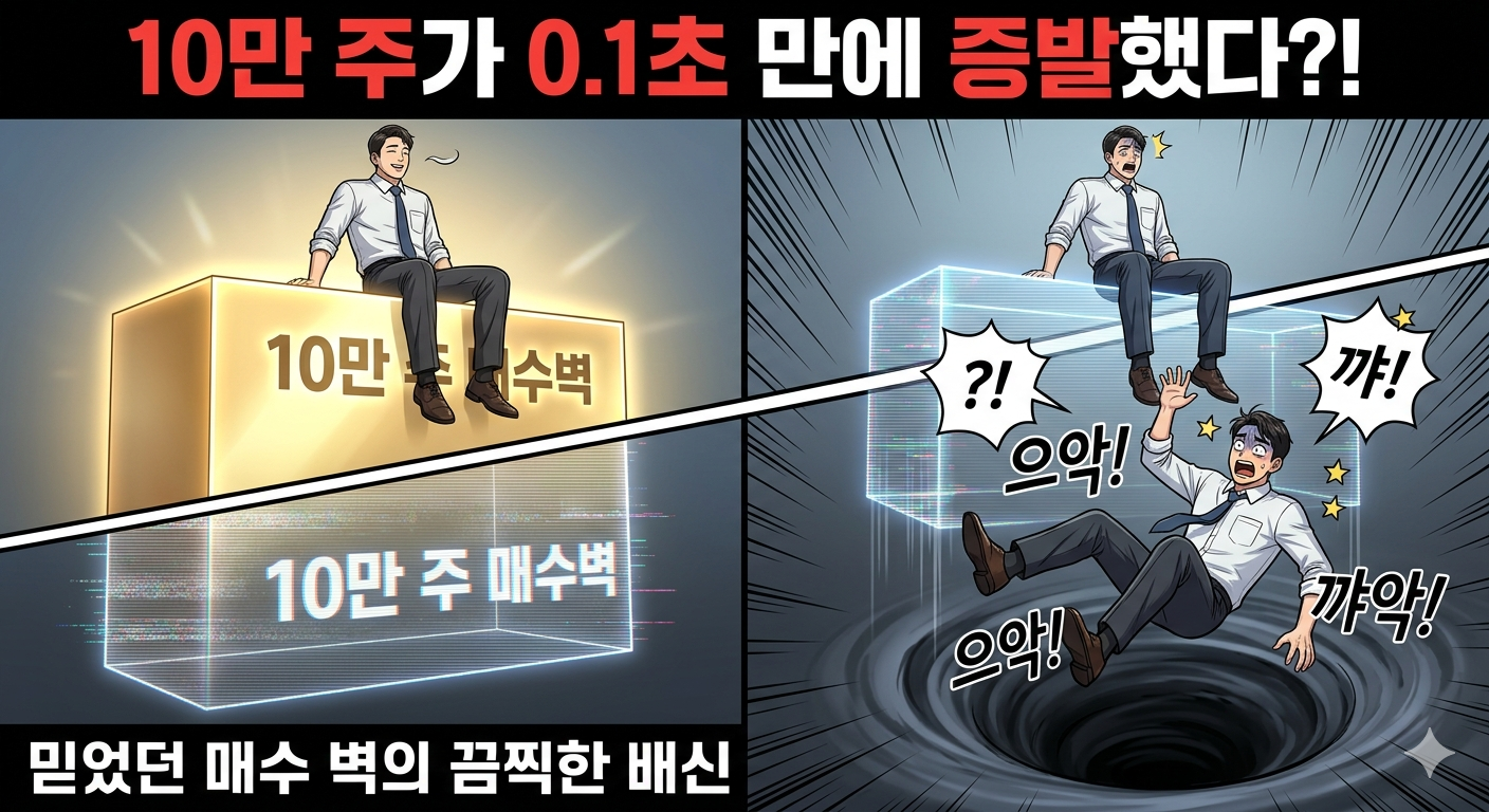 제 두 눈을 의심했습니다. 그 거대하고 든든했던 10만 주가 단 1초 만에 0주로 싹 취소되며 허공으로 증발해 버린 겁니다! 텅 비어버린 호가창 아래로 제 주식은 폭포수처럼 쏟아졌고, 저는 변기 위에서 비명을 지르며 -7% 지하실을 실시간으로 직관해야 했습니다. 여러분도 이 기막힌 마술 쇼에 당해보신 적 없으신가요?