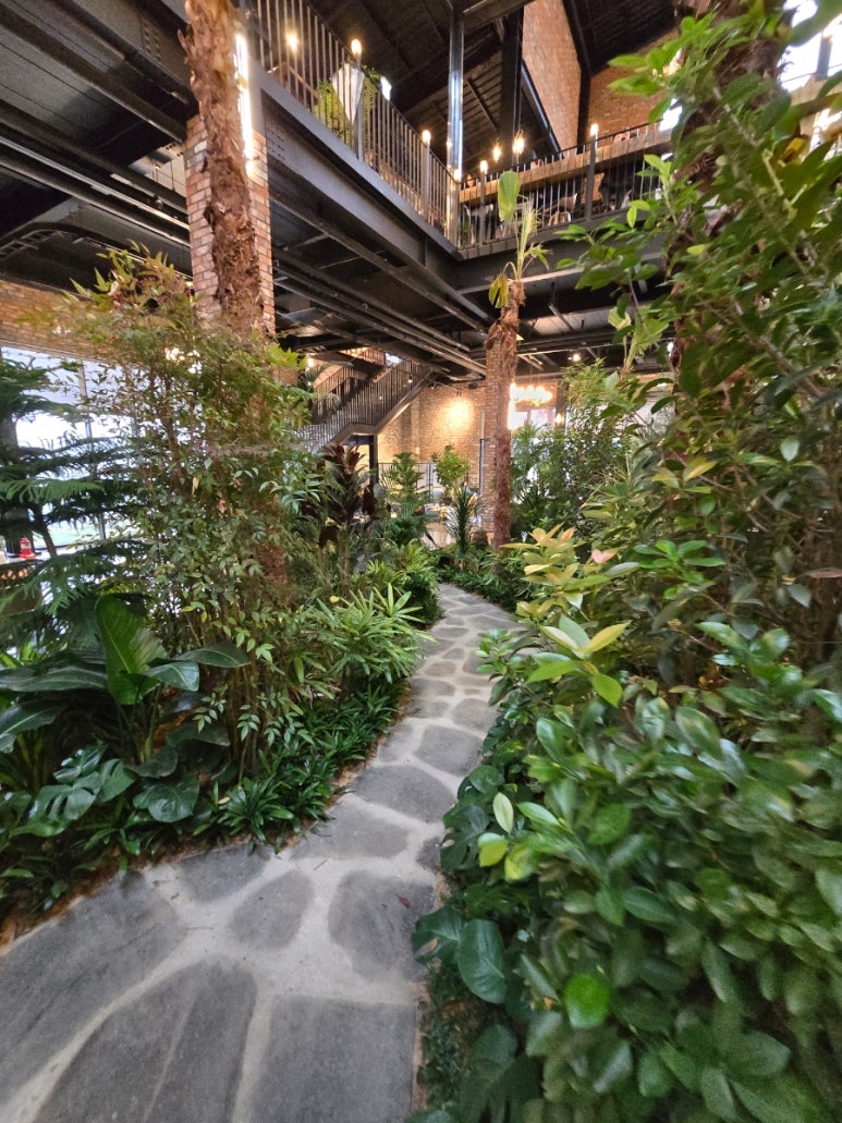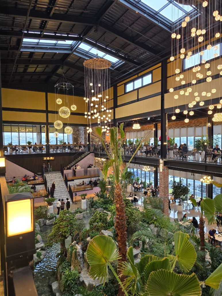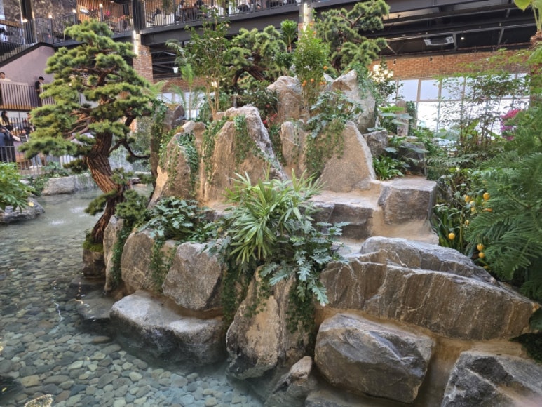 1층은 진짜 ‘실내 식물원’이라고 해도 될 만큼 초록초록한 공간이에요. 천장이 통유리로 되어 있어 자연광이 가득 들어오고, 중앙에는 작은 폭포와 연못까지 있어요!