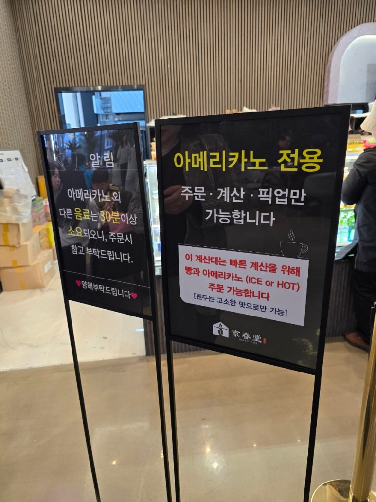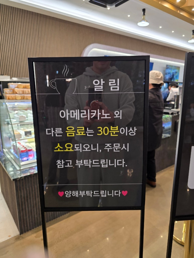 아메리카노 제외 음료는 ‘최소 30분 이상 대기’라고 안내되어 있었어요. 실제로도 꽤 오래 기다려야 했기 때문에, 빵이나 초밥을 먼저 드시면서 천천히 음료 받으시는 걸 추천드립니다.
