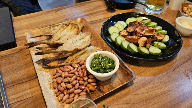 이번 방문에서 시킨 메뉴는 바로 명란버터구이와 노가리! 두 가지 모두 소맥과 궁합이 끝내줬어요.