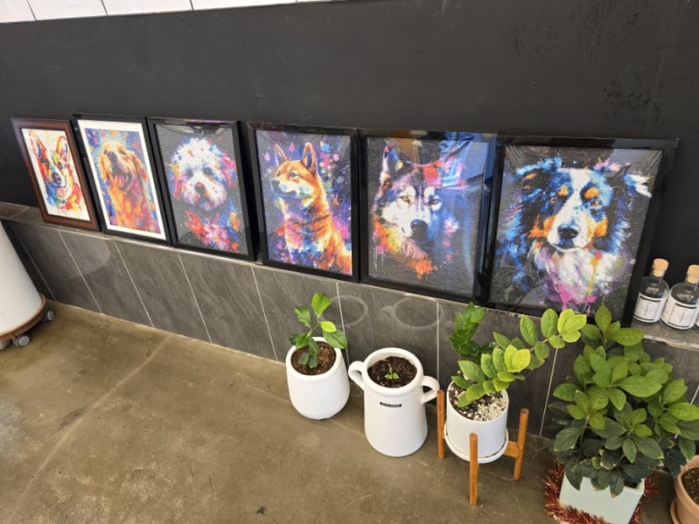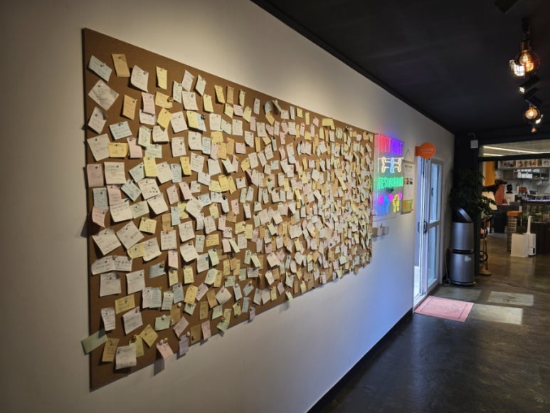 매장 한쪽에는 귀여운 인형, 수제 간식, 장난감 등 반려견 전용 쇼핑 코너도 마련되어 있어요. 보호자뿐 아니라 강아지도 함께 즐길 수 있도록 세심하게 구성되어 있습니다. 또한, 벽면에 포스트잇 메시지를 남길 수 있는 공간도 있어 방문자들의 따뜻한 흔적을 느낄 수 있어요.