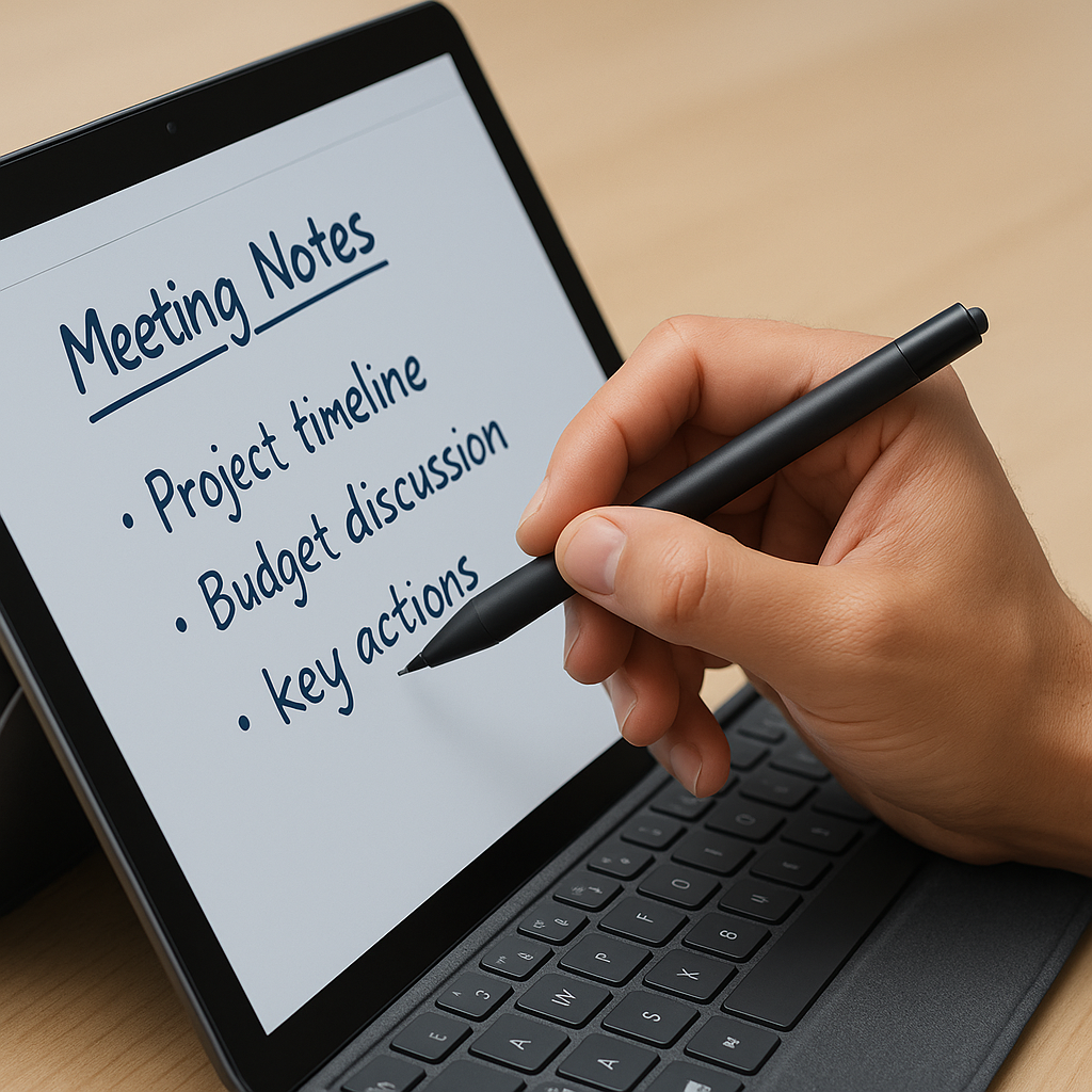 서피스 펜으로 회의 메모 필기하는 손 클로즈업