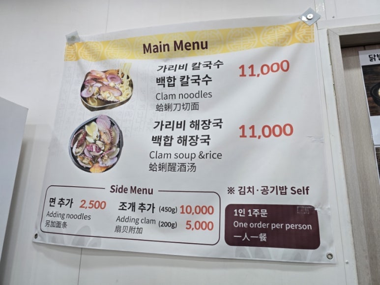 깔끔한 흰 간판에 ‘가리비 해장 칼국수’라는 큰 글씨가 딱! 입구는 단정하고 환한 분위기여서 첫인상부터 합격이었습니다👍