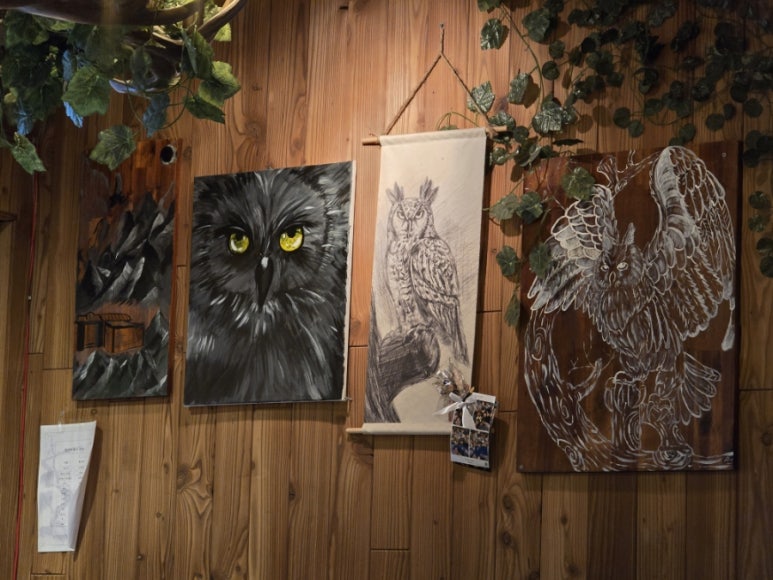 벽면에는 부엉이 일러스트가 가득 걸려 있고, 은은한 조명과 나무 테이블이 따뜻함을 더해줍니다. 술 한 잔 기울이기 딱 좋은 포근한 분위기. 실제로 혼술 손님도 꽤 많았어요. 감성 맛집으로는 확실히 인정입니다.